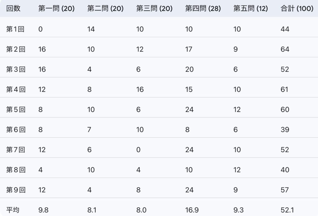 第4問、第5問では、ここ最近安定して得点できています。唯一、第6回の第4問で全く分からなくなってしまいましたが、復習すると解き方は理解できました。