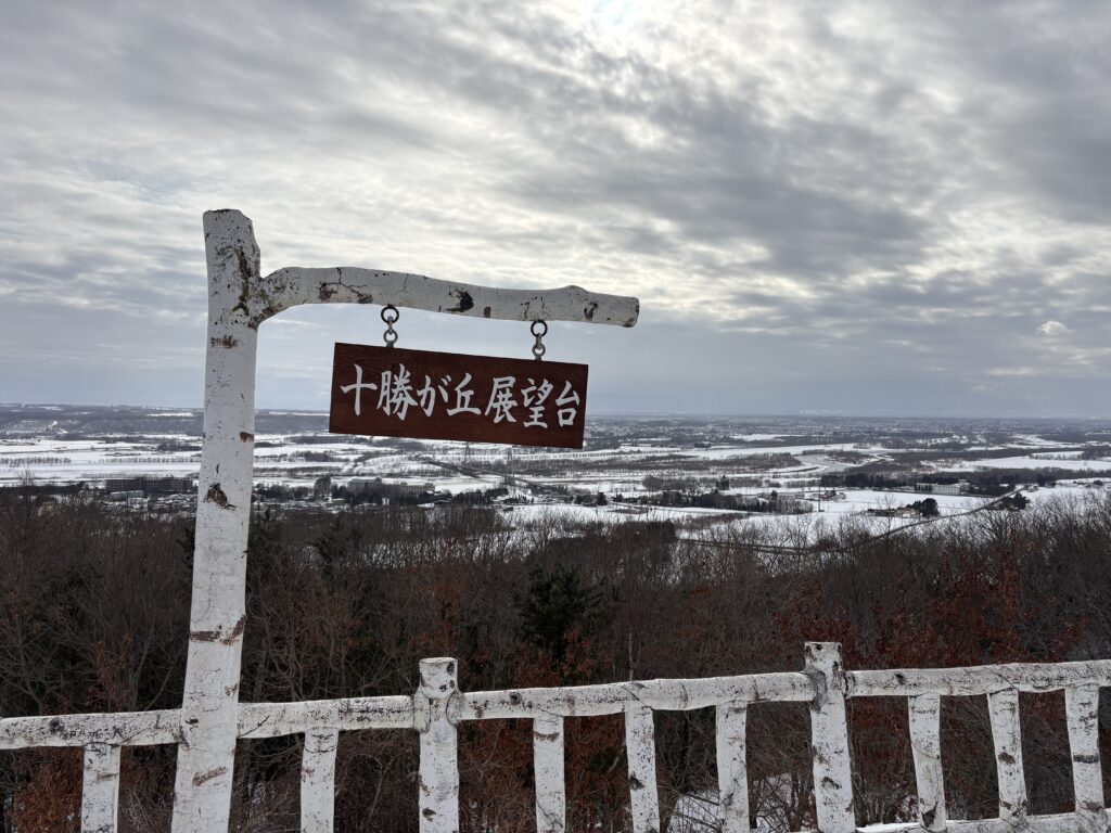 丘の上から十勝盆地を一望できます。雪景色の十勝平野は圧巻のスケールでした。