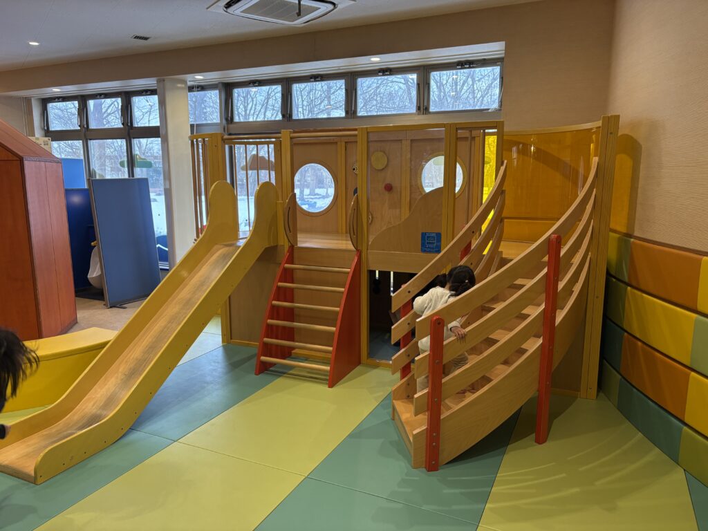 滑り台付きのキッズスペースがあり、娘は何度も滑って満喫していました(笑)。すぐ隣には「サケのふるさと 千歳水族館」があり、千歳川の川底を覗けたりサケの生態を学べたりと、一日中遊べるスポットです。